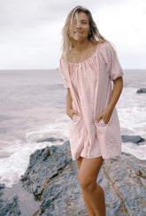 A soft, billowy dress ideal for those balmy Autumn days. Wear this dress everyday, or dress it up for evening drinks with friends. Made from a lovely blend of Organic Cotton and Linen in a baby Pink Gingham and features side pockets. Featuring a generous flowing fit, with adjustable drawstring at neckline to tighten or loosen the dress depending on how you want to wear it. Pull it in for a babydoll shape, or loosen it for an off-the-shoulder dress!