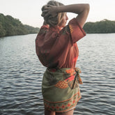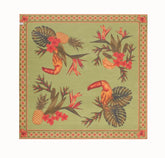 Our floaty lime cotton sarong, inspired by vintage Cuban florals and tropical daydreams. Toucans, pineapples, and bird of paradise bloom across hand-drawn sarong in lush greens with highlights of coral reds.