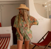 The Dahlia Moss shirt features soft, hand-painted dahlias with a leafy green backdrop printed on lightweight organic cotton. A nod to the blousy blooms of an English garden in full summer. The relaxed silhouette is elevated by a contrast placket, printed with a delicate vintage chain-inspired watercolour motif for a subtle touch of edge.