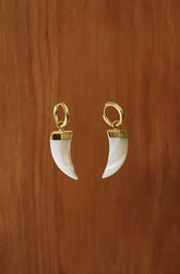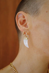 Mother of Pearl shark tooth hanging upon 10mm hinge hoops stainless steel with gold electroplating.