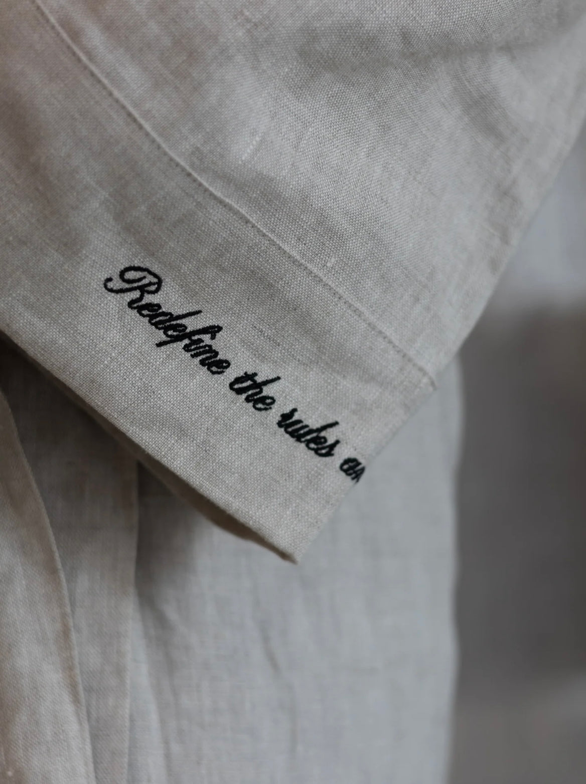 rōbu; Indulge in effortless elegance with our 100% linen robe, draped in a serene natural colourway that whispers timeless sophistication. the embroidered sleeve detailing, reading “redefine the rules and reach for the moon,” adds a poetic touch, inspiring you to dream boldly.