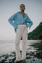 This season's fashion statement is the Shiloh Lace Pant in White, a sheer statement piece made from delicate unlined lace. It features a fixed front waistband for a streamlined silhouette and an elasticated back for comfort and ease. The pants fall to a dramatic maxi length and are finished with a scalloped edge hem, adding a soft, romantic touch.