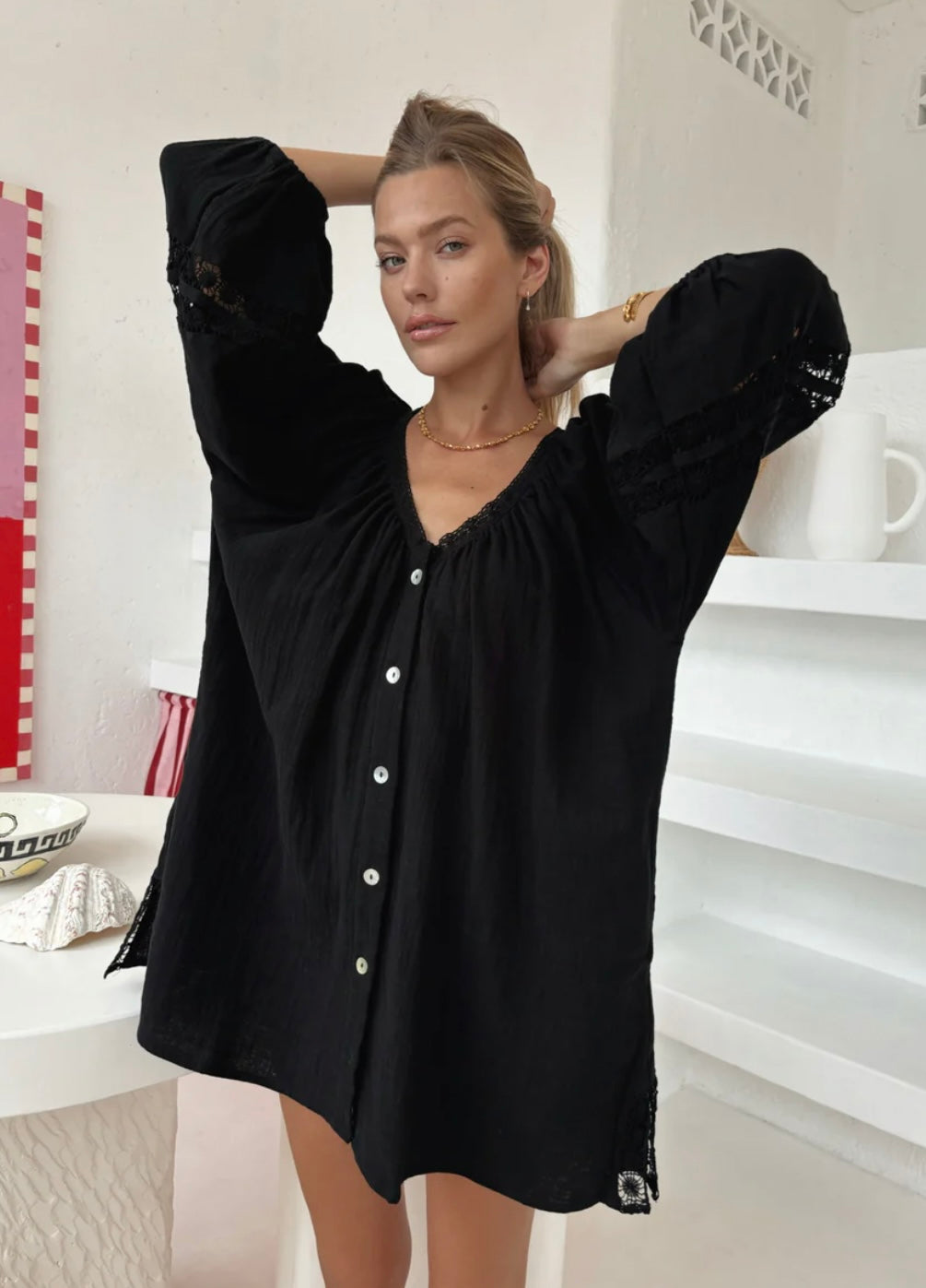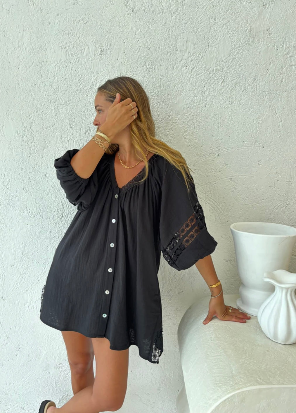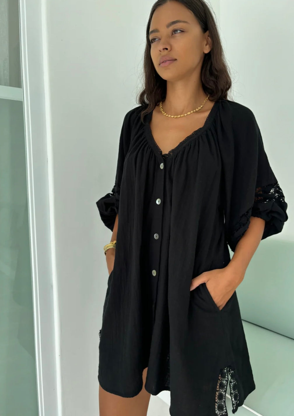 The Mini Dress features side pockets, billow sleeves, shell button details and hand dyed lace trims.